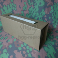 Reproduktion mit gestreiftem, umlaufendem Band, Zweidornschnalle und Tragschlaufe am oberen Ende. Boden verklebt und geheftet. Drei Stück gehören in den Patronenkasten 900, fünf Stück in die Patronenkästen 88 und Luftdichter Patronenkasten B.