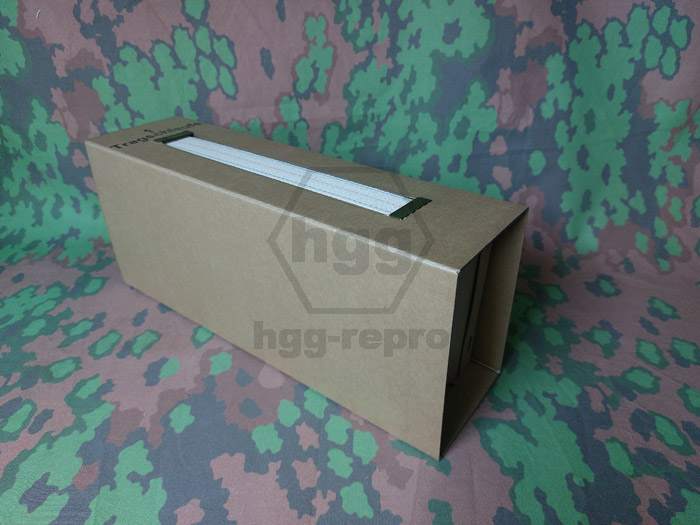 Reproduktion mit gestreiftem, umlaufendem Band, Zweidornschnalle und Tragschlaufe am oberen Ende. Boden verklebt und geheftet. Drei Stück gehören in den Patronenkasten 900, fünf Stück in die Patronenkästen 88 und Luftdichter Patronenkasten B.