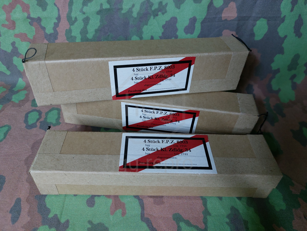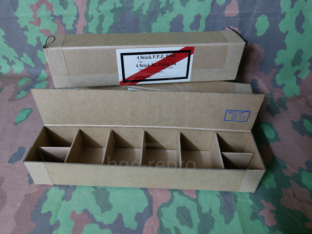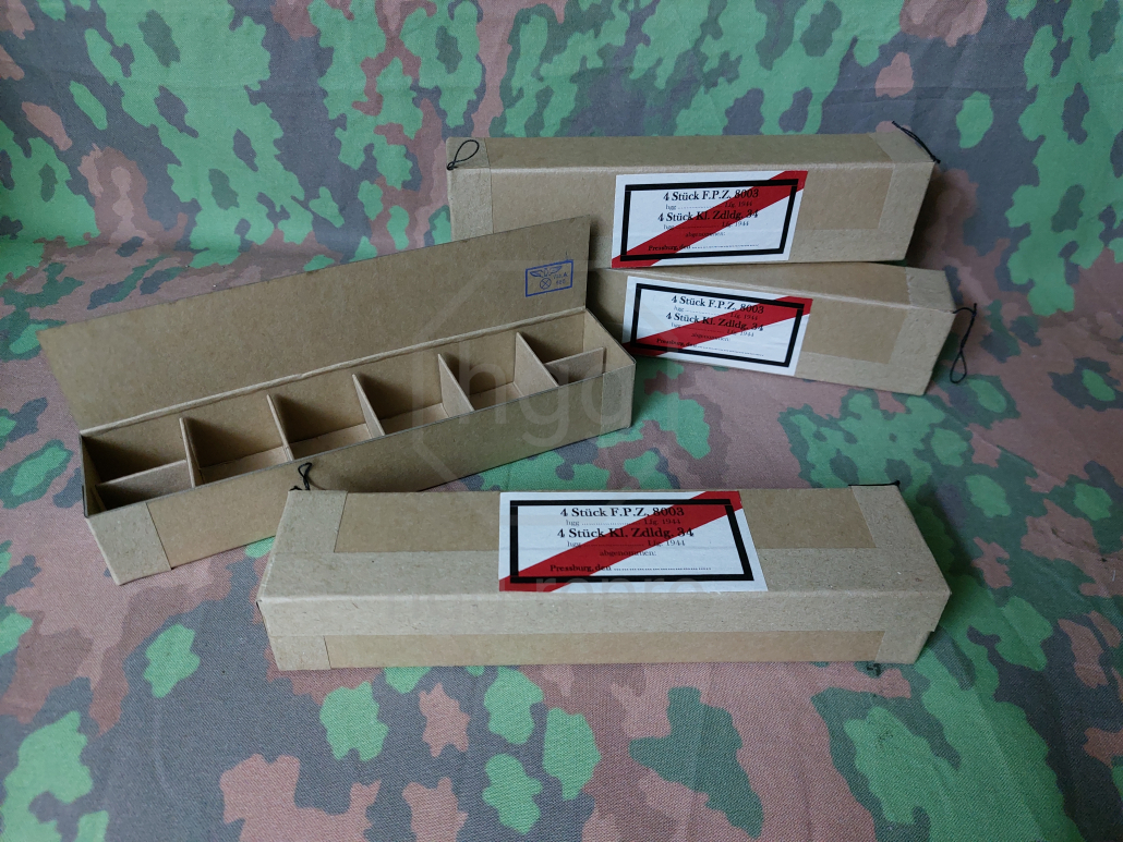 Detailgetreue Nachfertigung der Pappschachtel für die Faustpatronenzünder 8003 und der kleinen Zündladung 34. Version aus solidem Karton, nicht aus Wellpappe. So in jeder Holzkiste mit 4 Panerfaust 30, 60 oder 100 vorhanden gewesen. Die Panzerfäuste mussten vor Benutzung erst mit Zünder und Zündladung bestückt werden.