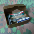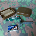 Nachbildung eines vollständigen Rasursets in brauner Kunststoffdose mit der Prägung „HGG Weltklasse“. Beinhaltet Rasierhobel, Ersatzklingen und Rasiercreme, verpackt in einer Bakelit-ähnlichen Dose mit Pappeinteilung. Authentisches Replikat für Reenectment oder Historical Living.
