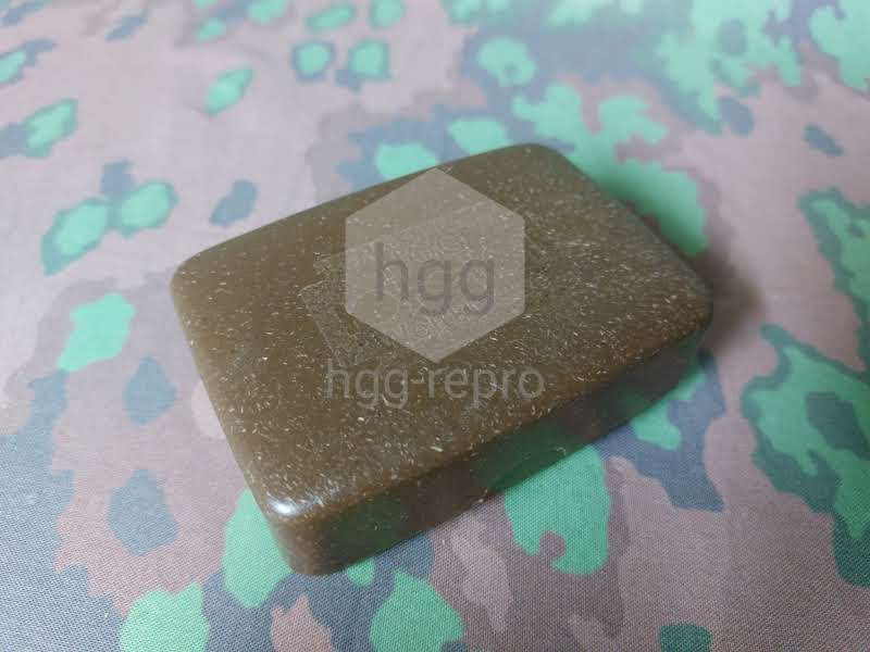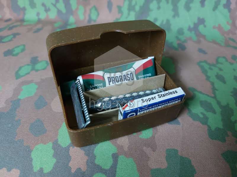Nachbildung eines vollständigen Rasursets in brauner Kunststoffdose mit der Prägung „HGG Weltklasse“. Beinhaltet Rasierhobel, Ersatzklingen und Rasiercreme, verpackt in einer Bakelit-ähnlichen Dose mit Pappeinteilung. Authentisches Replikat für Reenectment oder Historical Living.