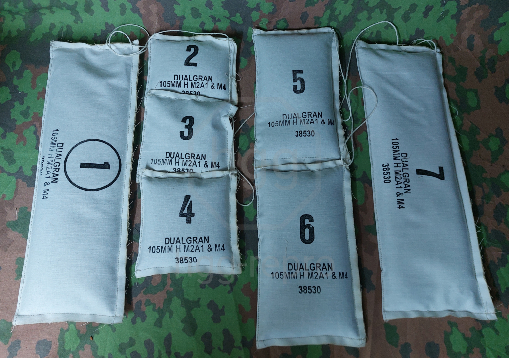 Ladungsaufbau der US-Amerikanischen leichten Haubitze M2, M2A1 und M4 mit den Teilkartuschen 1 bis 7 wie sie nach 1943 in vereinfachter Form eingeführt wurden. Die Teilkartuschen sind mit ungefährlichem Granulat gefüllt, und imitieren in Größe, Aussehen und Gewicht die Treibladung in der Hülse der Haubitze. Die Beutel sind wie im Original mit einer Schnur verbunden, um ein schnelles Entfernen einzelner Beutel aus der Kartusche zu ermöglichen. Bei diesem Artikel erhalten Sie die Druckform, bei der jeder Beutel einzeln gestempelt wurde. Perfekt für Museum, Display und Reenactment.